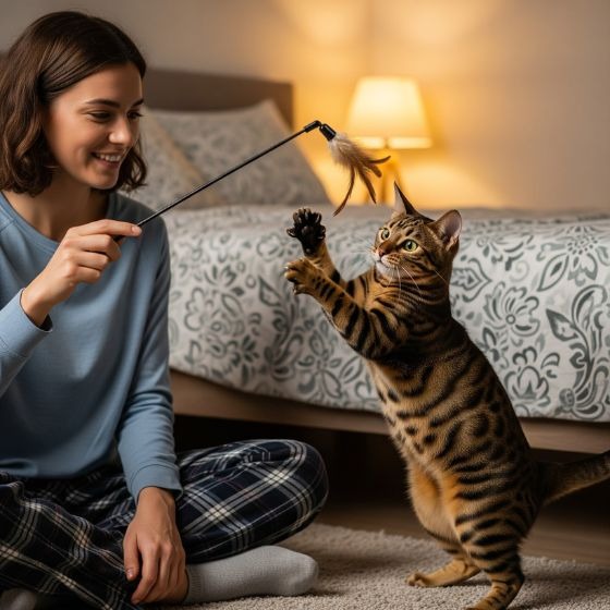 Spend 15 to 20 minutes playing with your cat before you go to bed. Use a wand toy to help your cat run and jump during playtime. This will help them burn energy and be ready to sleep when the lights go out.