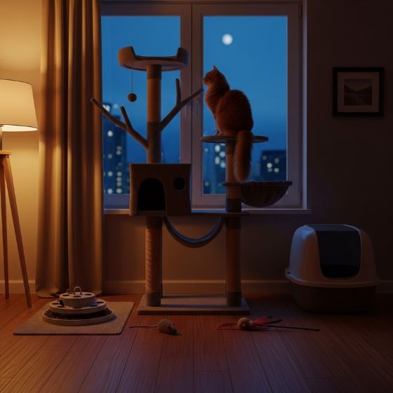 Set up a soft perch near a window so your cat can watch outside at night. This keeps them entertained and less likely to wake you.