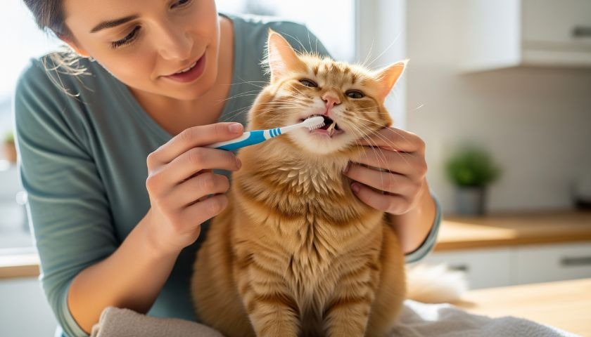 Start slow. First, let your cat taste the toothpaste. Then use a finger brush and gently work up to brushing. Aim for the outer surfaces of the teeth; you don’t need to force the mouth open.
